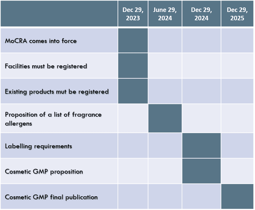 MoCRA required the FDA to determine by regulation which fragrance allergens must be disclosed in cosmetic label. Cosmetic lable will be required to identify every fragrance allergen in a product. The labeling requirement will take effect at the end of 2024.